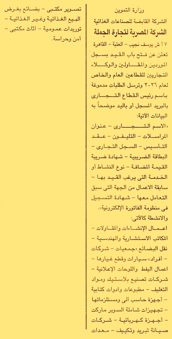 فتح باب القيد بسجل الموردين والمقاولين والوكلاء التجاريين لعام 2026 في الأنشطة الأتية