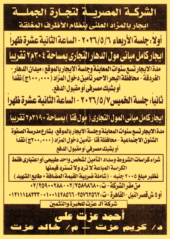 HOT information مزايدة علنية لعملية تأجير كامل مباني مول الدهار التجاري بمساحة 304م2 تقريبا بميدان الدهار – الغردقة – محافظة البحر الأحمر لمدة 9 سنوات عن جريدة الجمهورية Post navigation الإدارة العامة لصرف جنوب شرق البحيرة هيئة النقل العام بالقاهرة