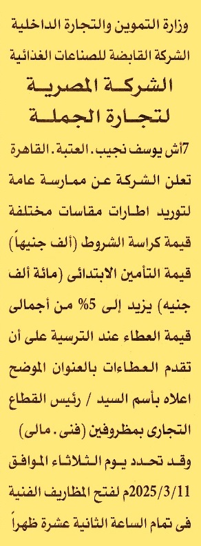 HOT Information ممارسة عامة لعملية توريد اطارات مقاسات مختلفة عن جريدة الأهرام Post navigation منظمة الأغذية والزراعة للأمم المتحدة شركة مطاحن مصر الوسطى