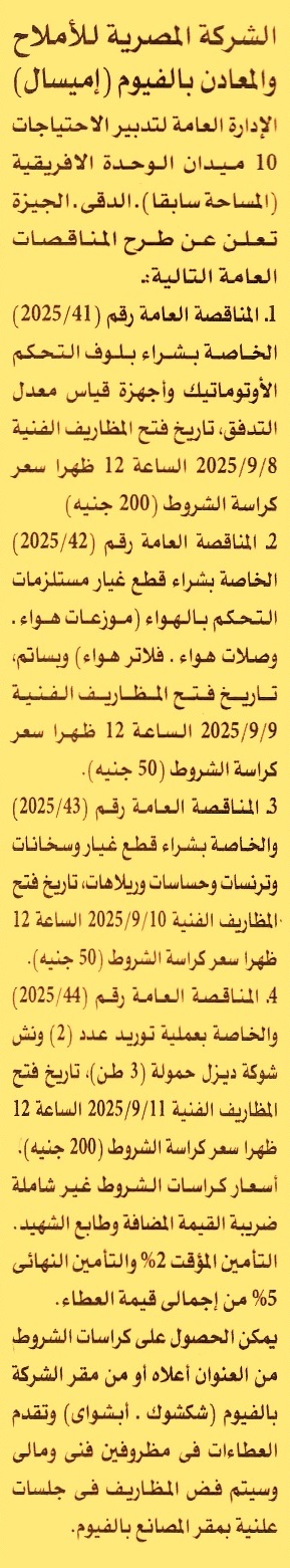 HOT Information مناقصة عامة رقم 41/2025 لعملية توريد بلوف التحكم الأوتوماتيك وأجهزة قياس معدل التدفق عن جريدة الأهرام Post navigation الهيئة العامة لموانئ البحر الأحمر شركة مصر العليا لتوزيع الكهرباء
