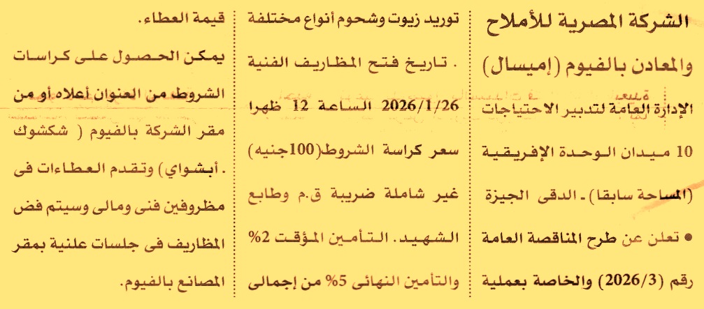 HOT information مناقصة عامة رقم 3/2026 لعملية توريد زيوت وشحوم أنواع مختلفة عن جريدة الأهرام Post navigation شركة مياه الشرب بالقاهرة الكبرى مركز شباب مدينة الشهداء