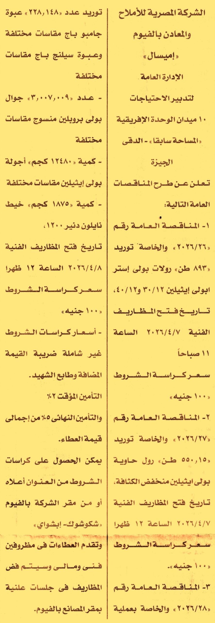 HOT Information مناقصة عامة رقم 26/2026 لعملية توريد 893 طن رولات بولي إستر وبولي إيثيلين 12/30 و12/40 عن جريدة الأخبار Post navigation جهاز حماية وتنمية البحيرات والثروة السمكية جامعة مدينة السادات