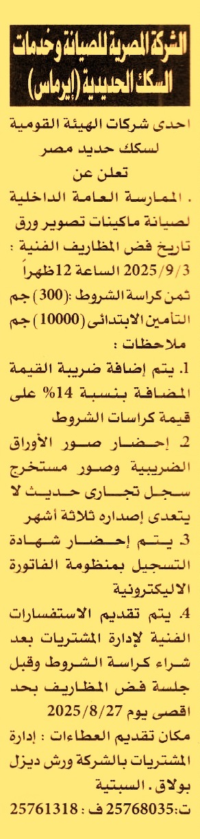 HOT Information ممارسة داخلية عامة لعملية صيانة ماكينات تصوير ورق (يجب أن يكون السجل التجاري حديث ولا يتعدى على إصداره 3 أشهر وأخر موعد لتقديم الإستفسارات يوم 27/8/2025) عن جريدة الأهرام Post navigation شركة الوجه القبلي لإنتاج الكهرباء رئاسة مدينة القرين