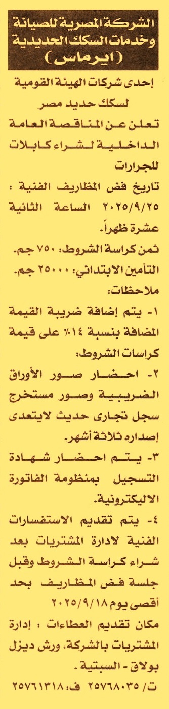 HOT Information مناقصة داخلية عامة لعملية توريد كابلات للجرارات (يجب أن يكون السجل التجاري حديث ولا يتعدى على إصداره 3 أشهر وأخر موعد لتقديم الإستفسارات يوم 27/8/2025) عن جريدة الأخبار Post navigation محافظة الشرقية جامعة جنوب الوادي بقنا
