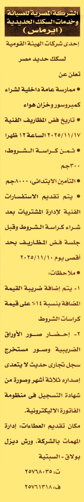 HOT Information مناقصة داخلية عامة لعملية توريد كمبروسور وخزان هواء (يجب أن يكون السجل التجاري حديث ولا يتعدى على إصداره 3 أشهر وأخر موعد لتقديم الإستفسارات يوم 10/11/2025) عن جريدة الأخبار Post navigation المكتب الكويتي للمشروعات الخيرية بالقاهرة جامعة أسيوط الأهلية