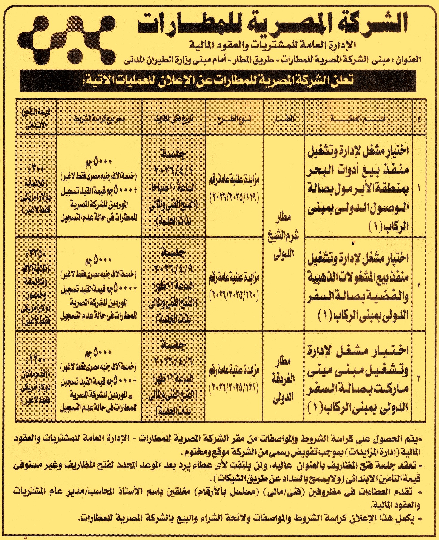 HOT information مزايدة علنية عامة رقم 119/2025/2026 لعملية اختيار مشغل لإدارة وتشغيل منفذ بيع أدوات البحر بمنطقة الأير مول بصالة الوصول بمبنى الركاب 1 بمطار شرم الشيخ الدولي عن جريدة الأهرام Post navigation شركة ميناء القاهرة الجوي مديرية الشئون الصحية بالغربية