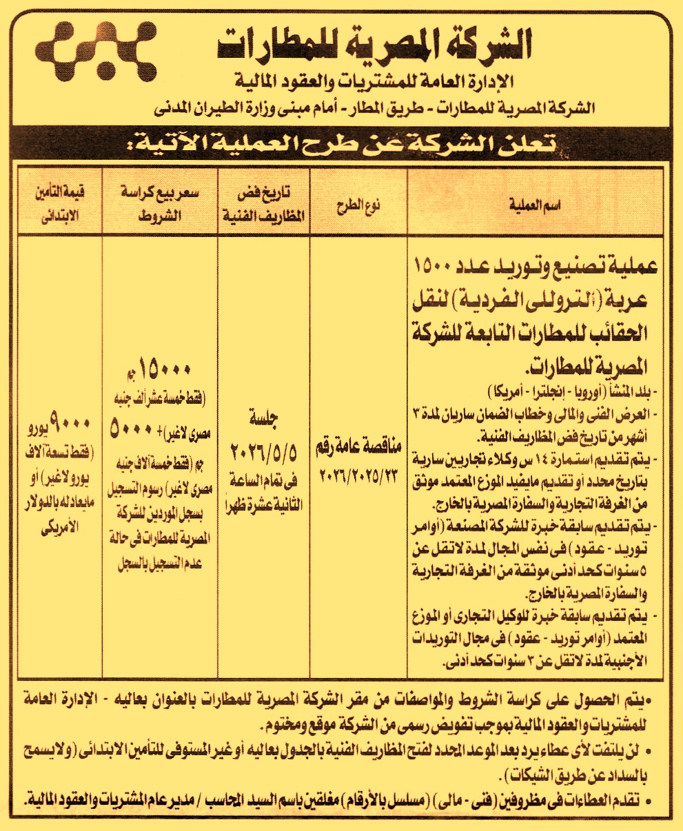 تصنيع وتوريد عدد 1500 عربة “التروللي الفردية” لنقل الحقائب للمطارات التابعة للشركة