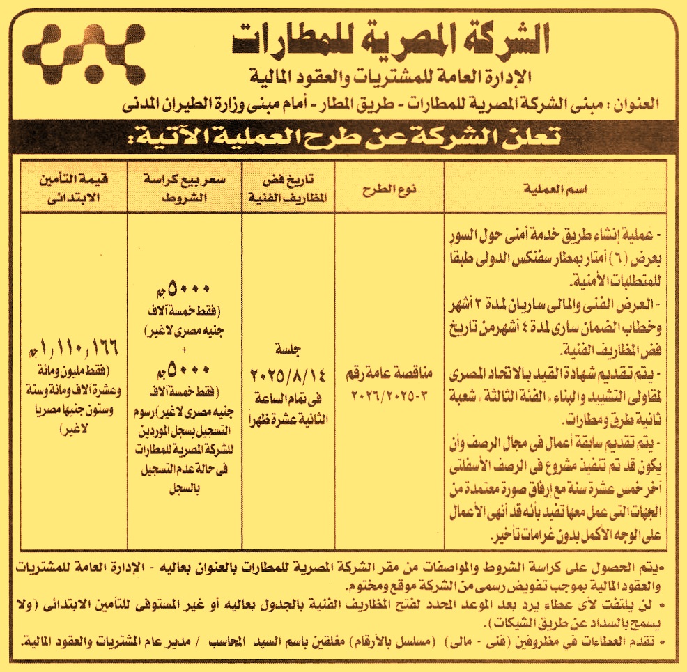 إنشاء طريق خدمة أمني حول السور بعرض 6م بمطار سفنكس الدولي طبقا للمتطلبات الأمنية