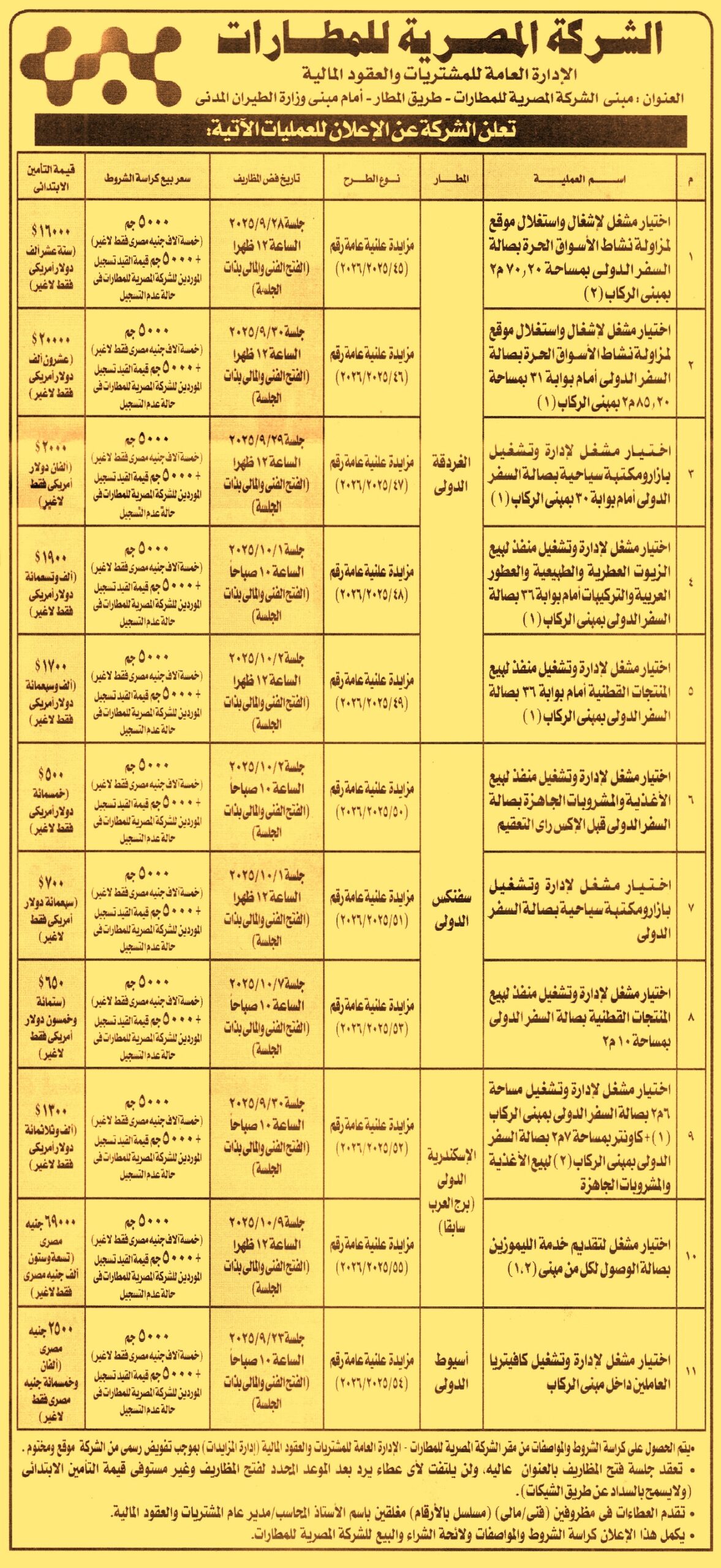 HOT Information مزايدة علنية عامة رقم 45/2025/2026 لعملية اختيار مشغل لإشغال واستغلال موقع لمزاولة نشاط الأسواق الحرة بصالة السفر الدولي بمساحة 70.20م2 بمبنى الركاب 2 بمطار الغردقة الدولي عن جريدة الأهرام Post navigation المصفي القضائي/ خالد عبد الغني رئاسة حي حلوان