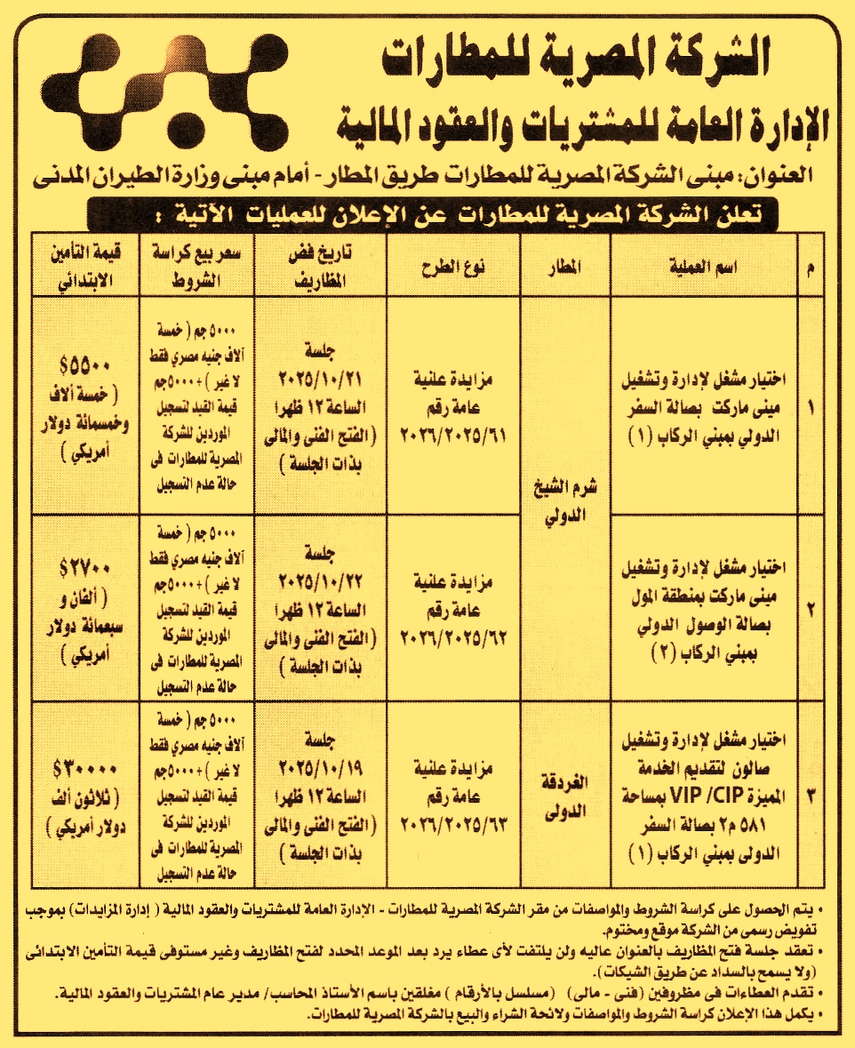 HOT information مزايدة علنية عامة رقم 61/2025/2026 لعملية اختيار مشغل لإشغال واستغلال ميني ماركت بصالة السفر الدولي بمبنى الركاب 1 بمطار شرم الشيخ الدولي عن جريدة الأهرام Post navigation الشركة المصرية لتجارة الأدوية شركة الوجه القبلي لإنتاج الكهرباء
