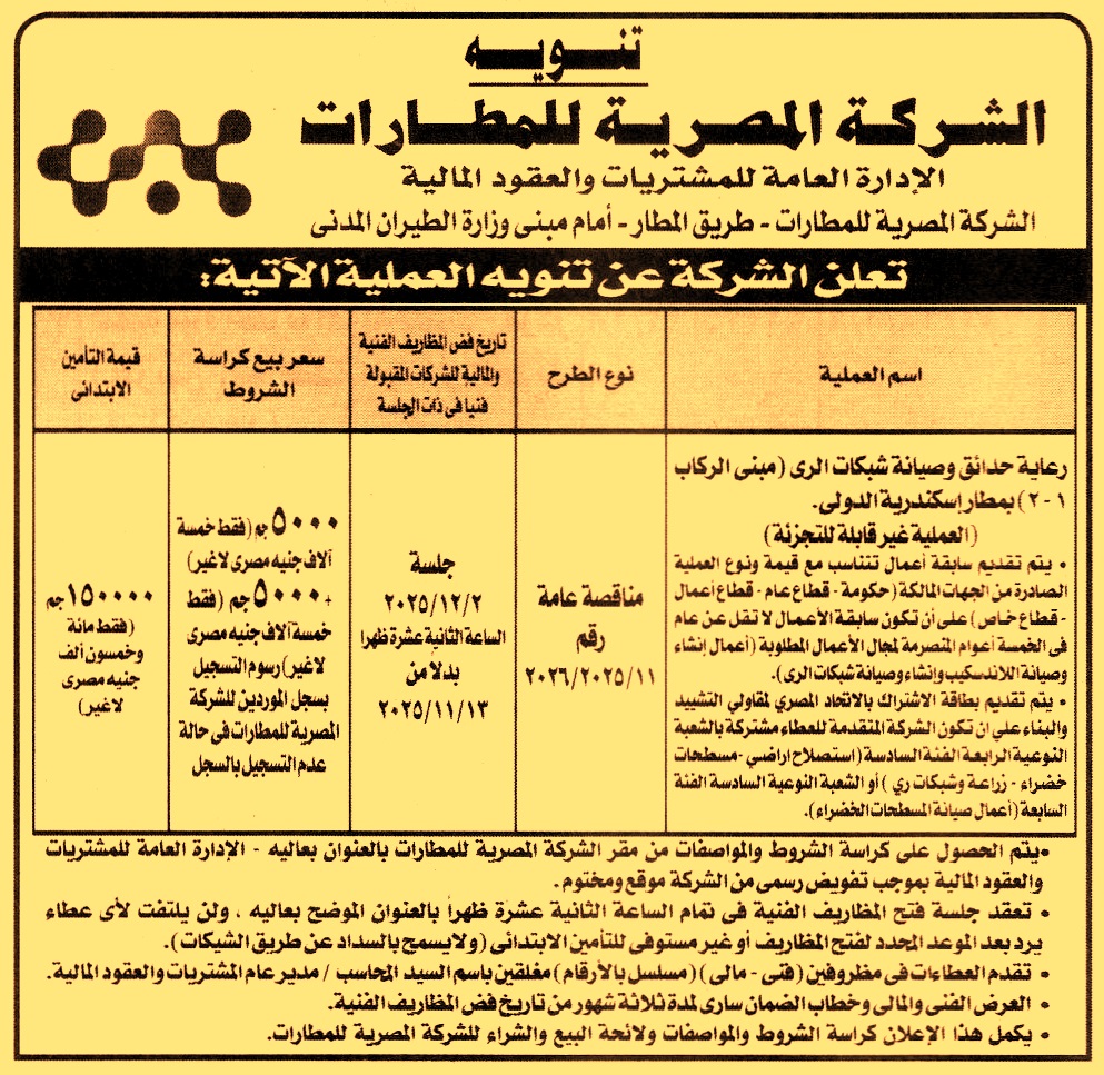 رعاية حدائق وصيانة شبكات الري لمبنى الركاب 1, 2 بمطار الإسكندرية الدولي
