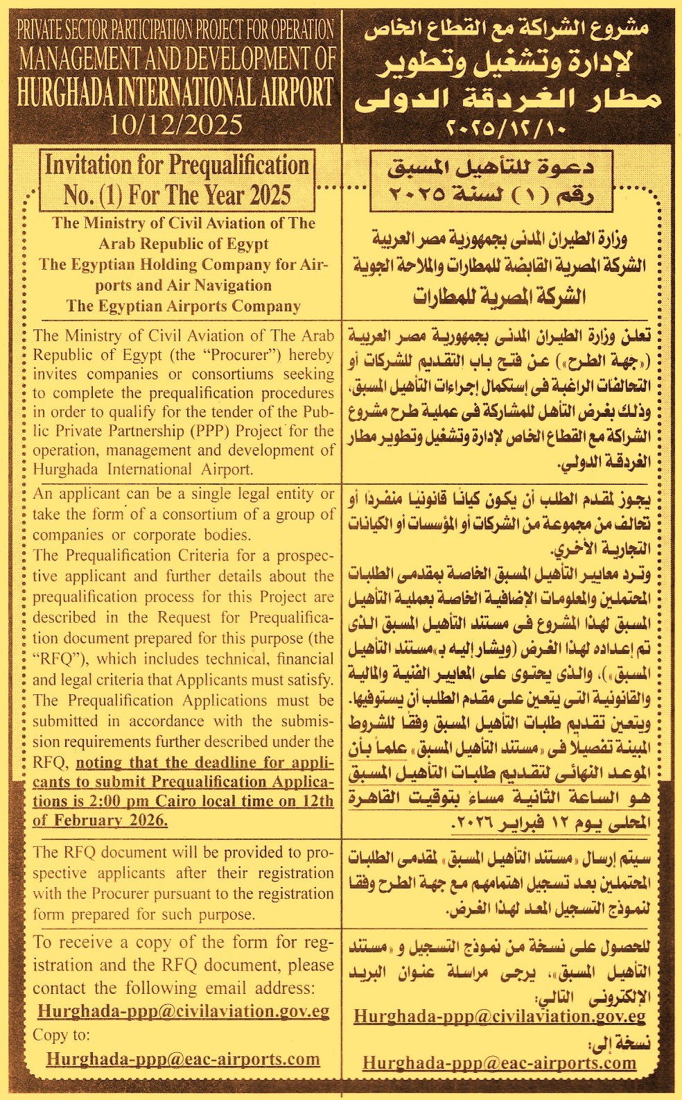 علماً بأن الموعد النهائى لتقديم طلبات التأهيل المسبق هو الساعة الثانية مساءً بتوقيت القاهرة المحلى يوم 12/2/2026
