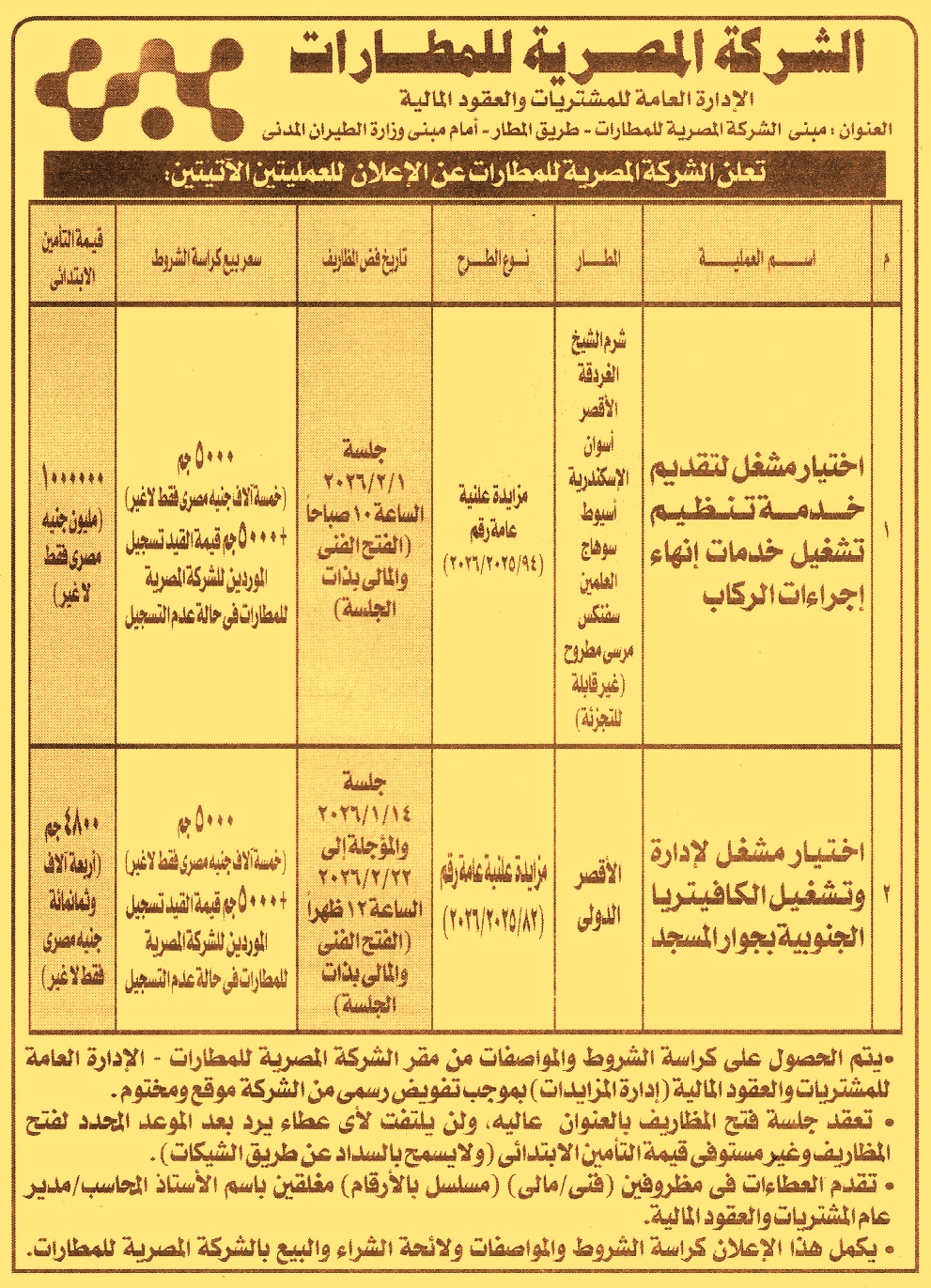 HOT Information مزايدة علنية عامة رقم 94/2025/2026 لعملية اختيار مشغل لتقديم خدمة تنظيم تشغيل خدمة إنهاء إجراءات الركاب بمطارات شرم الشيخ والغردقة والأقصر وأسوان والإسكندرية وأسيوط وسوهاج والعلمين وسفنكس ومرسى مطروح عن جريدة الأهرام Post navigation نادي جرين هيلز المركز الطبي للعاملين بقطاع البترول بالسويس