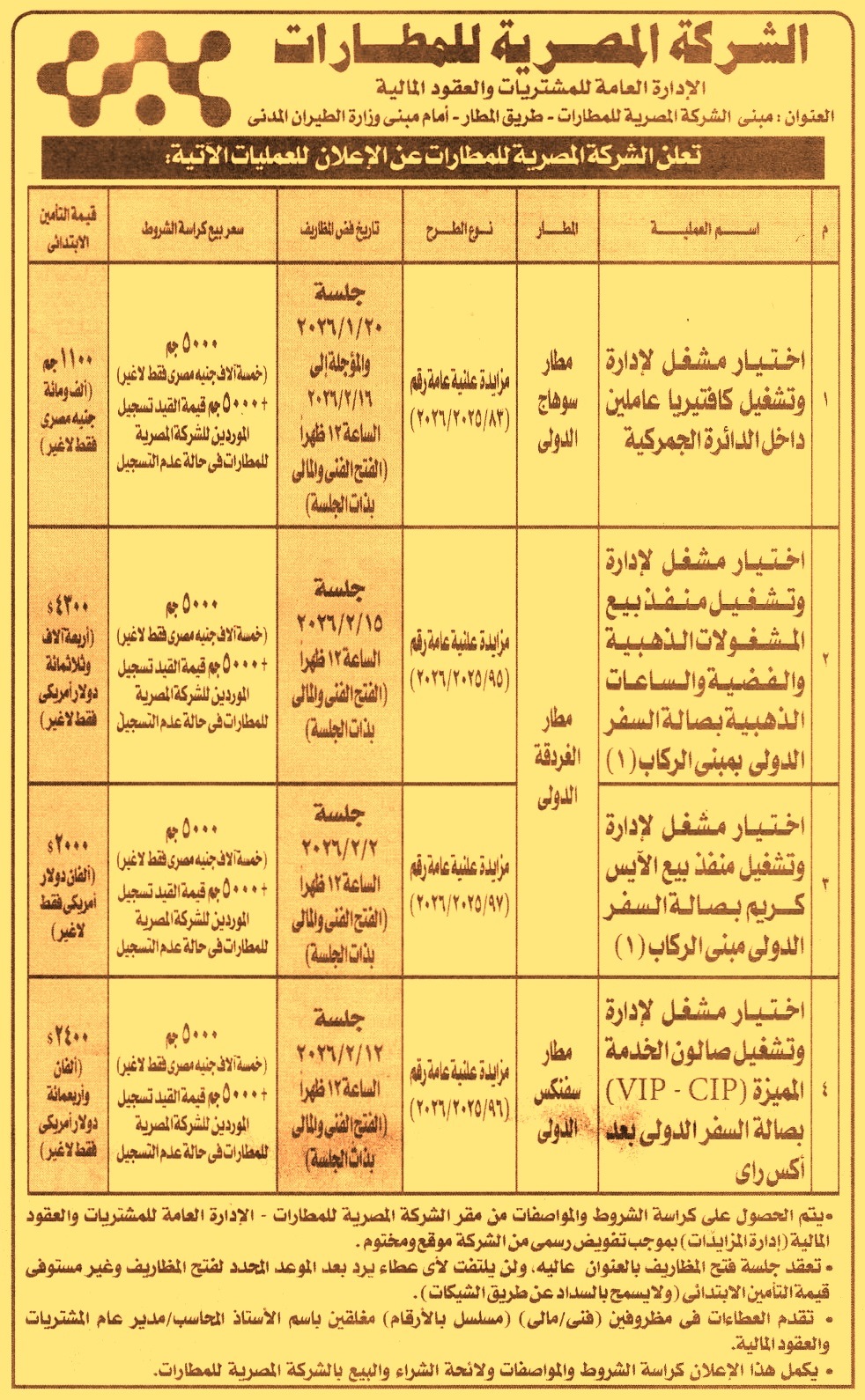 HOT information مزايدة علنية عامة رقم 95/2025/2026 لعملية اختيار مشغل لإدارة وتشغيل منفذ بيع المشغولات الذهبية والفضية والساعات الذهبية بصالة السفر الدولي بمبنى الركاب 1 بمطار الغردقة الدولي عن جريدة الأهرام Post navigation مؤسسة مصر الخير الهيئة القومية للأنفاق
