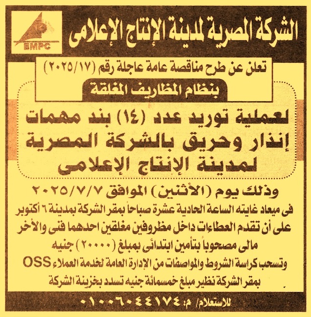HOT Information مناقصة عامة عاجلة رقم 17/2025 لعملية توريد عدد 14 بند مهمات إنذار وحريق بالشركة عن جريدة الأهرام Post navigation جمعية علي بن أبي طالب الخيرية بنك مصر