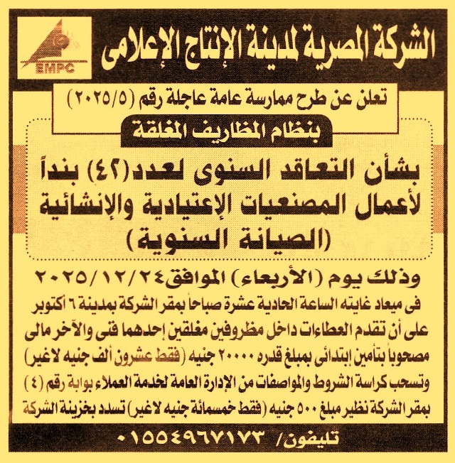 التعاقد السنوي لعدد 42 بند لأعمال المصنعيات الإعتيادية والإنشائية