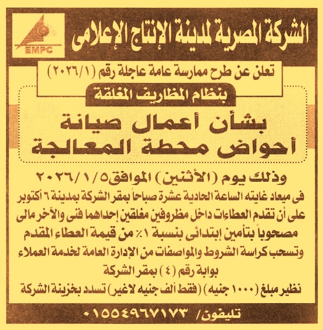 HOT Information ممارسة عامة رقم 1/2026 لعملية صيانة أحواض محطة المعالجة عن جريدة الأخبار Post navigation شركة مياه الشرب والصرف الصحي بالجيزة الشركة المصرية للخدمات الرياضية بقطاع البترول