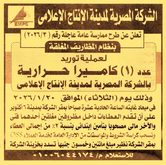 HOT Information ممارسة عامة رقم 3/2026 لعملية توريد عدد 1 كاميرا حرارية بالشركة عن جريدة الأخبار Post navigation مركز شباب شلقان مديرية الشباب والرياضة بالغربية