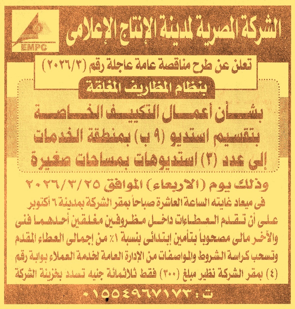 HOT information مناقصة عامة رقم 1/2026 لعملية تنفيذ أعمال التكييف الخاصة بتقسيم استديو “9ب” بمنطقة الخدمات إلى عدد 3 استديوهات بمساحات صغيرة عن جريدة الأخبار Post navigation قطاع الموارد المائية والري والبنية القومية بشمال سيناء الإدارة العامة للموارد المائية والري بشرق الدقهلية