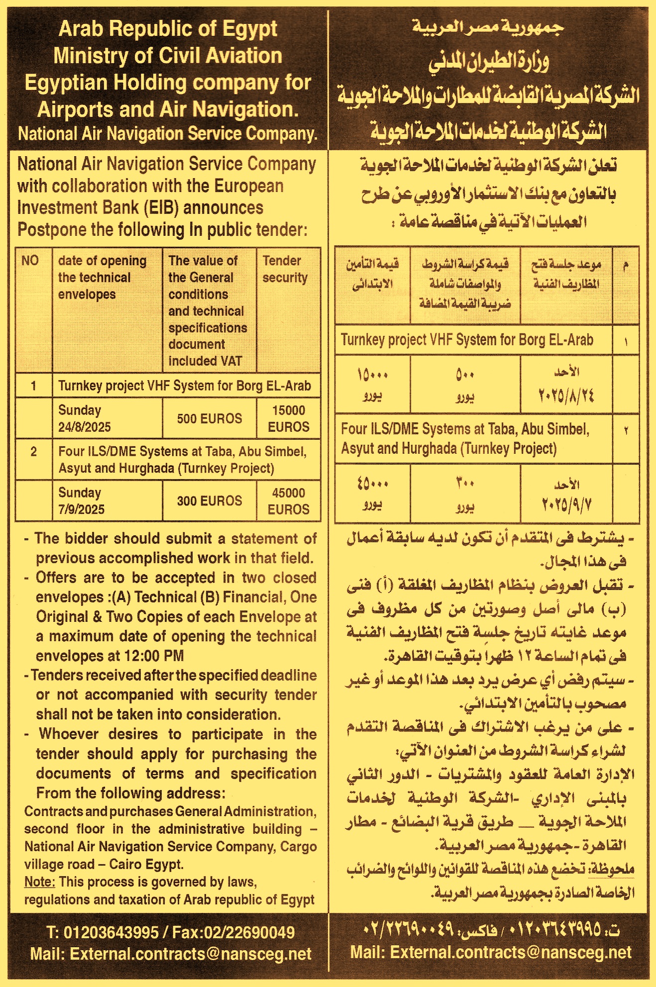 HOT Information مناقصة عامة لعملية تنفيذ أعمال Turnkey project of VHF Systems for Borg El-Arab والعملية بالتعاون مع بنك الاستثمار الأوروبي (يرفق مع المستندات سابقة أعمال وتقدم المظاريف من أصل وصورتين) عن جريدة الأهرام Post navigation البنك الاهلي المصري شركة شمال الدلتا لتوزيع الكهرباء