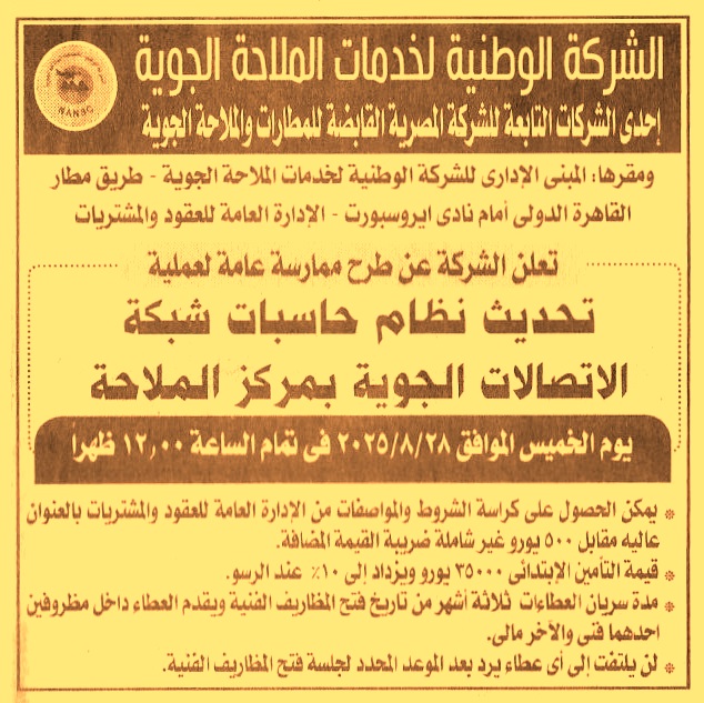 HOT Information ممارسة عامة لعملية تحديث نظام حاسبات شبكة الاتصالات الجوية بمركز الملاحة (مدة سريان العطاءات 3 أشهر) عن جريدة الأخبار Post navigation شركة الخدمات الطبية محافظة المنيا