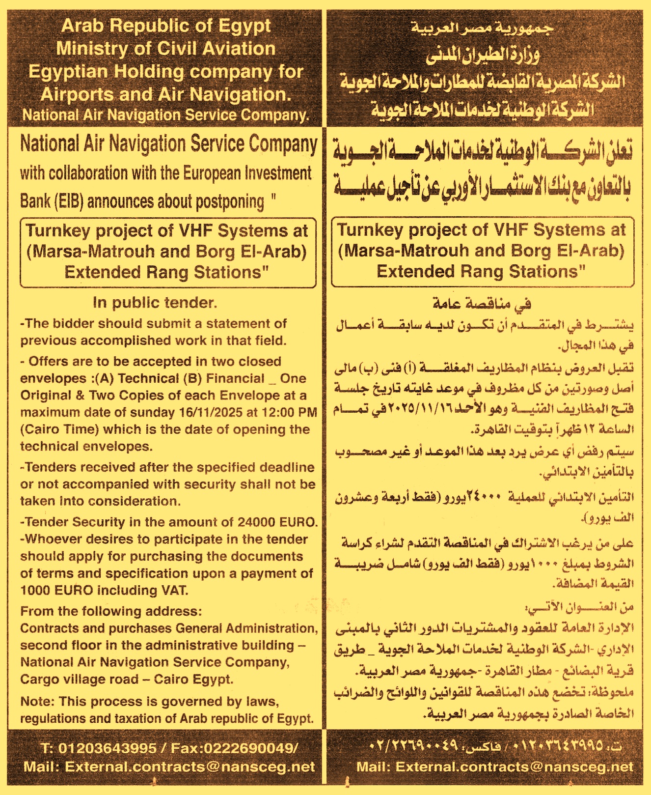 تنفيذ أعمال Turnkey project of VHF Systems at Marsa-Matrouh and Borg El-Arab Extended Range Station