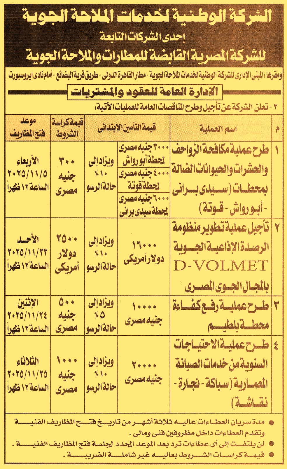 HOT Information مناقصة عامة لعملية مكافحة الزواحف والحشرات والحيوانات الضالة بالمحطات الأتية (1) محطة سيدي براني (2) محطة أبو رواش (3) محطة قوتة (مدة سريان العطاءات 3 أشهر) عن جريدة الجمهورية Post navigation الهيئة العامة للأرصاد الجوية محافظة المنيا
