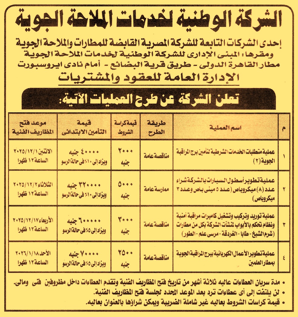 HOT Information مناقصة عامة لعملية تنفيذ متطلبات الخدمات الشرطية لتأمين برج المراقبة الجوية 2 (مدة سريان العطاءات 3 أشهر) عن جريدة الأهرام Post navigation شركة مياه الشرب والصرف الصحي بأسيوط والوادي الجديد مركز شباب الشموت
