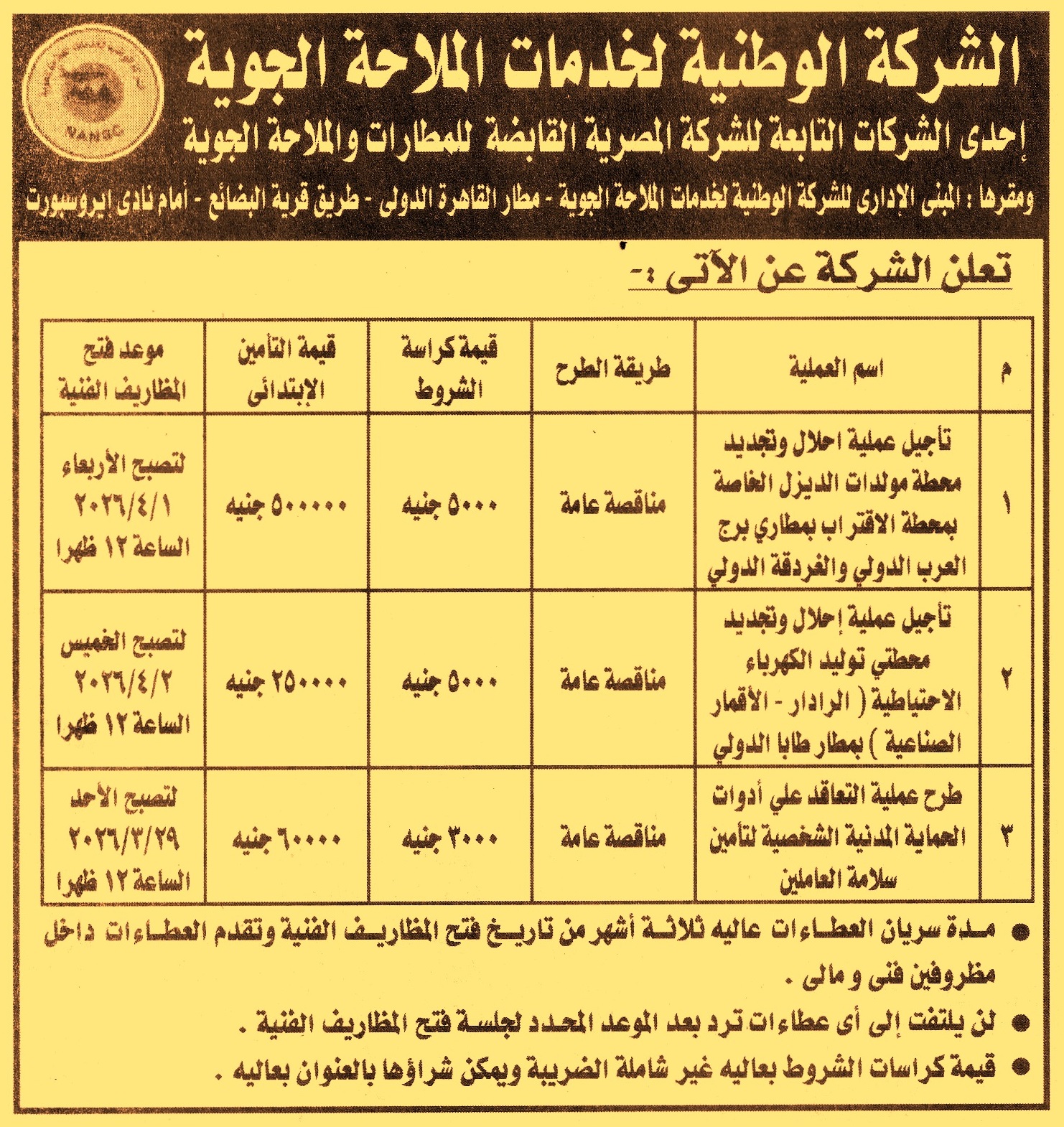 HOT information ممارسة عامة لعملية التعاقد على أدوات الحماية المدنية الشخصية لتأمين سلامة العاملين (مدة سريان العطاءات 3 أشهر) عن جريدة الأهرام Post navigation الشركة القابضة لمصر للطيران الشركة الوطنية لخدمات الملاحة الجوية