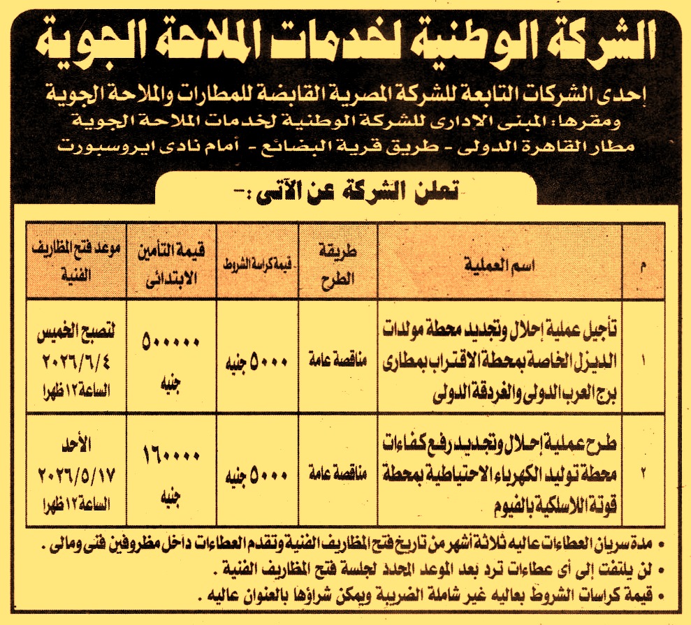 HOT Information مناقصة عامة لعملية إحلال وتجديد رفع كفاءات محطة توليد الكهرباء الاحتياطية بمحطة قوتة اللاسلكية بالفيوم (مدة سريان العطاءات 3 أشهر) عن جريدة الأهرام Post navigation وزارة الشباب والرياضة شركة إستثمارية كبرى
