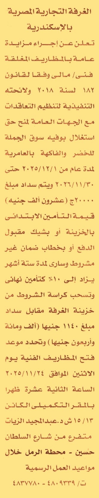HOT Information مزايدة عامة لعملية حق استغلال بوفيه سوق الجملة للخضر والفاكهة بالعامرية لمدة عام من 1/12/2025 حتى 30/11/2026 (يسدد التأمين نقدا أو بشيك أو بخطاب ضمان ساري لمدة 6 أشهر) عن جريدة الأخبار Post navigation الهيئة العامة للتأمين الصحي فرع المنوفية مركز المعلومات ودعم اتخاذ القرار برئاسة مجلس الوزراء