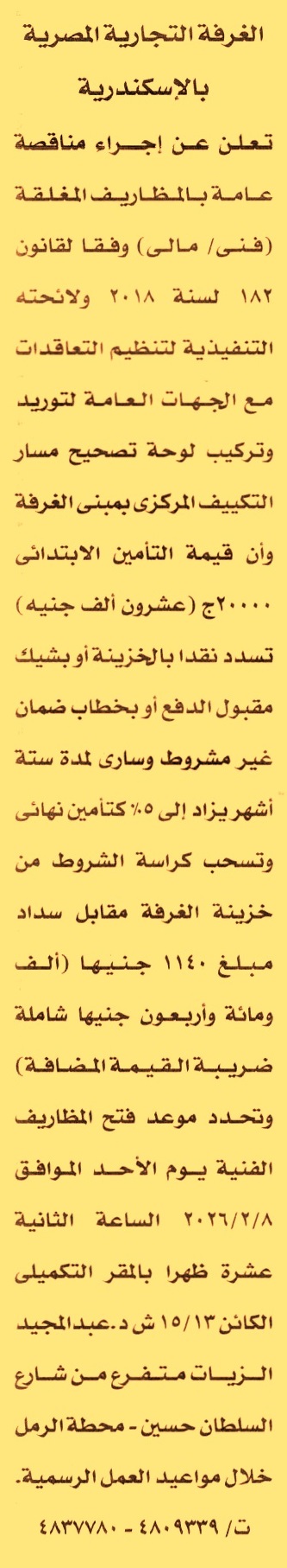 HOT Information مناقصة عامة لعملية توريد وتركيب لوحة تصحيح مسار التكييف المركزي بمبنى الغرفة (مدة سريان خطاب الضمان 6 أشهر) عن جريدة الأخبار Post navigation وزارة الزراعة واستصلاح الأراضي نادي سموحة الرياضي الاجتماعي