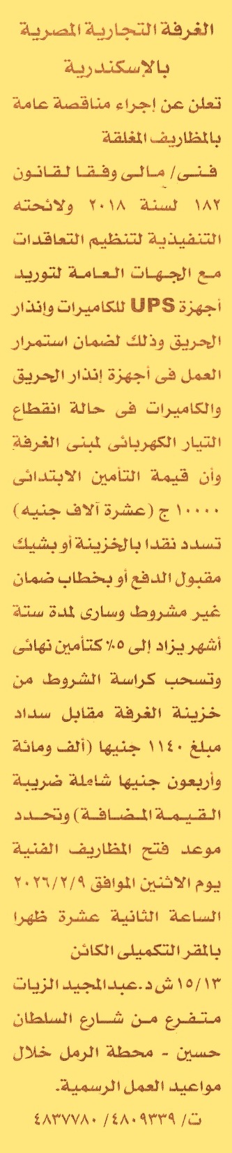 HOT Information مناقصة عامة لعملية توريد أجهزة UPS للكاميرات وإنذار الحريق وذلك لضمان استمرار العمل في أجهزة إنذار الحريق والكاميرات في حالة انقطاع التيار الكهربائي (مدة سريان خطاب الضمان 6 أشهر) عن جريدة الأخبار Post navigation مستشفيات جامعة المنوفية الجمعية التعاونية المركزية بدمياط