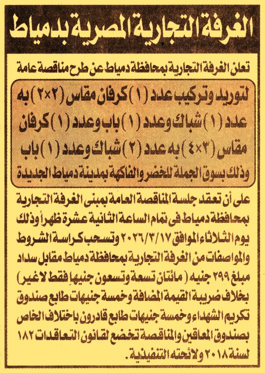 HOT Information مناقصة عامة لعملية توريد وتركيب عدد 1 كرفان مقاس 2×2 به عدد 1 شباك وعدد 1 باب وعدد 1 كرفان مقاس 3×4 به عدد 2 شباك وعدد 1 باب وذلك بسوق الجملة للخضر والفاكهة بمدينة دمياط الجديدة عن جريدة الجمهورية Post navigation نادي الصيادين الرياضي بالزقازيق البنك العقاري المصري العربي