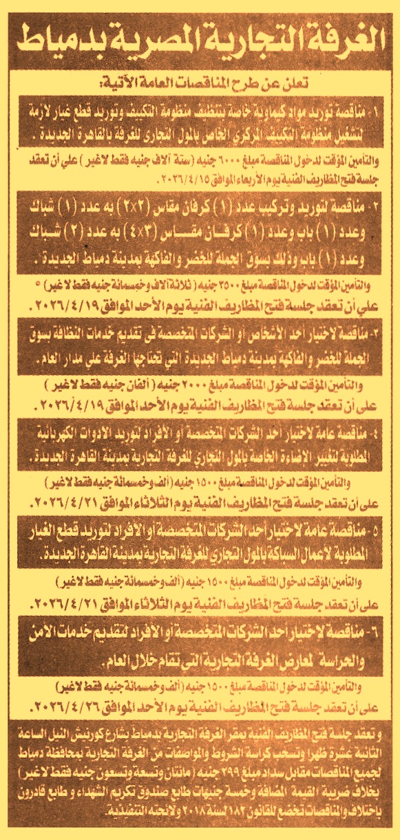 HOT Information مناقصة عامة لعملية توريد مواد كيماوية خاصة بتنظيم منظومة التكييف وتوريد قطع غيار لازمة لتشغيل منظومة التكييف المركزي الخاص بالمول التجاري للغرفة بالقاهرة الجديدة عن جريدة الجمهورية Post navigation جهاز تنمية مدينة العاشر من رمضان الوحدة المحلية لمركز ومدينة بلطيم