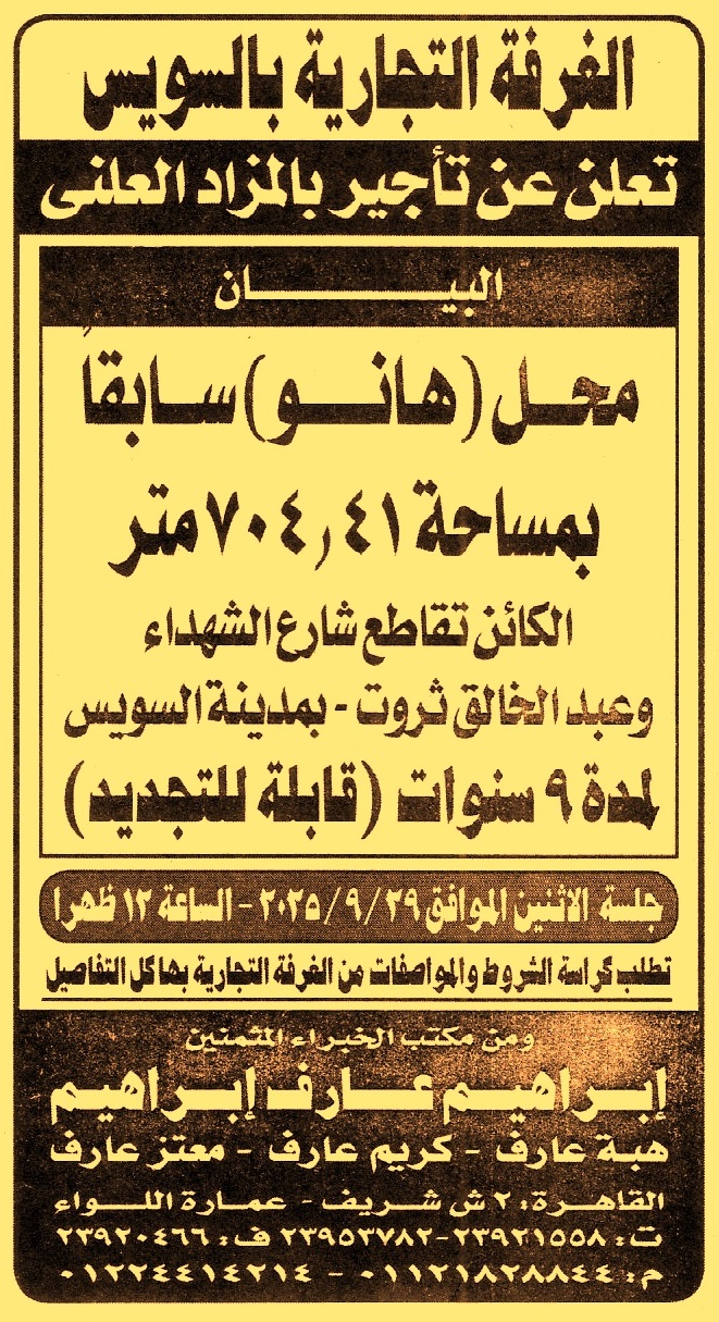 HOT Information مزايدة علنية لعملية تأجيل محل “هانو” سابقا بمساحة 704.41م الكائن بتقاطع شارع الشهداء وعبد الخالق ثروت – مدينة السويس لمدة 9 سنوات قابلة للتجديد عن جريدة الأهرام Post navigation شركة الكراكات المصرية بنك القاهرة