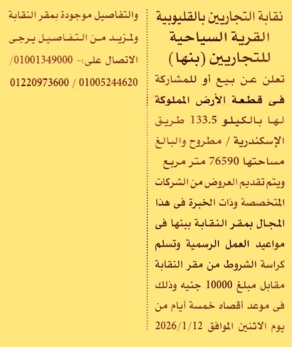 HOT Information مزايدة عامة لعملية بيع أو المشاركة في قطعة الأرض بمساحة 76590م2 (تقدم العطاءات من يوم 12/1/2026 ولمدة 5 أيام) عن جريدة الأهرام Post navigation محافظة قنا الشركة العامة لإستصلاح الأراضي والتنمية العمرانية