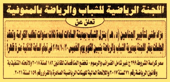 HOT Information مزايدة علنية لعملية تأجير الجناحين د, هـ بنزل الشباب بمدينة السادات لمدة 3 سنوات عن جريدة الجمهورية Post navigation مديرية الشئون الصحية بالوادي الجديد الوحدة المحلية لمركز ومدينة القنطرة غرب