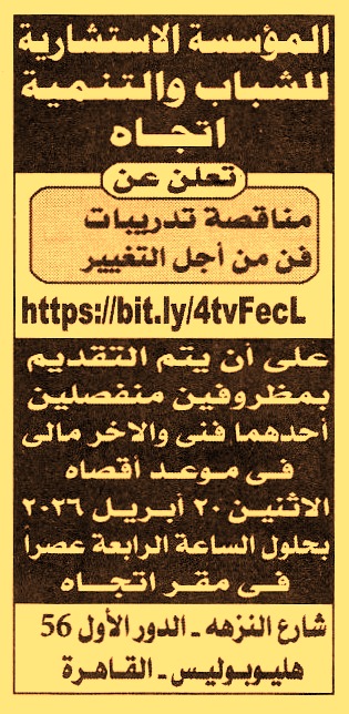 HOT Information مناقصة عامة لعملية تنفيذ تدريبات فن من أجل التغيير عن جريدة الأهرام Post navigation الشركة المصرية للصيانة وخدمات السكك الحديدية شركة الغازات البترولية