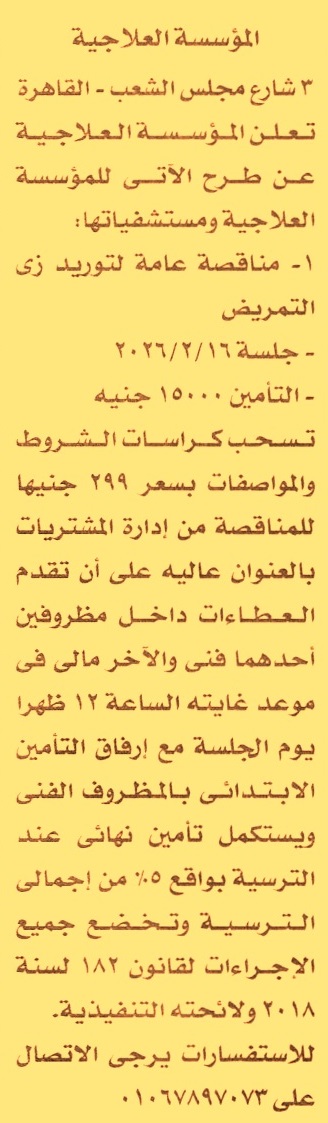HOT Information مناقصة عامة لعملية توريد زي التمريض عن جريدة الأخبار Post navigation جهاز تنمية مدينة 6 أكتوبر الهيئة المصرية العامة للمعارض والمؤتمرات