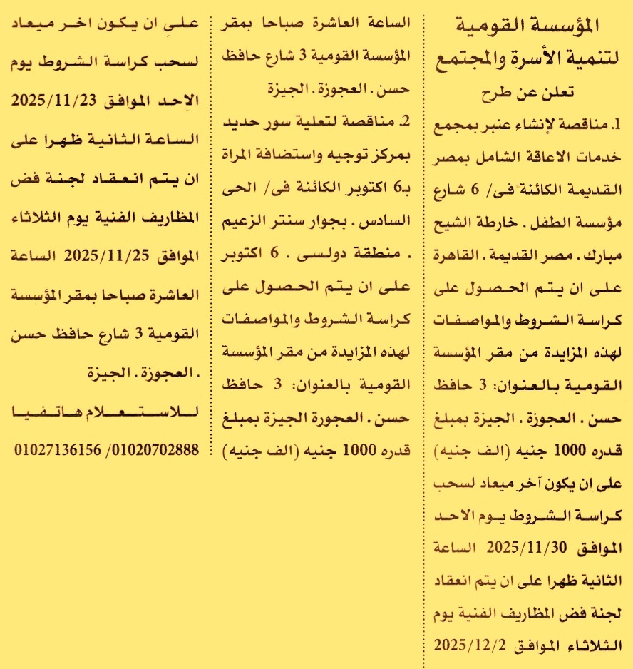 HOT information مناقصة عامة لعملية إنشاء عنبر بمجمع خدمات الإعاقة الشامل بمصر القديمة الكائنة في 6 شارع مؤسسة الطفل – خارطة الشيخ مبارك – مصر القديمة (أخر موعد لشراء الكراسة يوم 30/11/2025 الساعة 2 ظ) عن جريدة الأهرام Post navigation شركة النصر للتصدير والاستيراد شركة مصر العليا لتوزيع الكهرباء