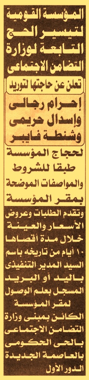 HOT information مناقصة عامة لعملية توريد إحرام رجالي وإسدال حريمي وشنطة فايبر لحجاج المؤسسة (تقدم العطاءات والعينة خلال 10 أيام من تاريخ الإعلان) عن جريدة الأهرام Post navigation جمعية مسجد د. مصطفي محمود مقر المستشفى مصانع سكر بنجر بلقاس