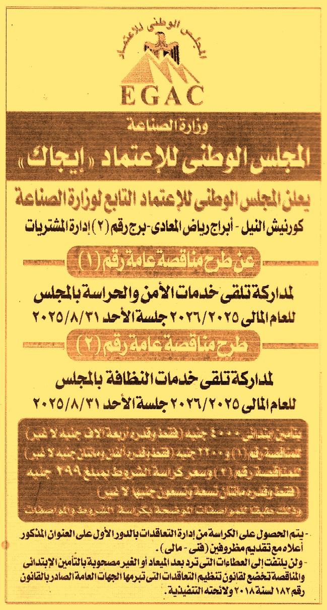HOT Information مناقصة عامة رقم 1 لعملية مداركة تلقي خدمات الأمن والحراسة بالمجلس للعام المالي 2025/2026 عن جريدة الجمهورية Post navigation حي الشرابية مديرية الشباب والرياضة بالمنوفية