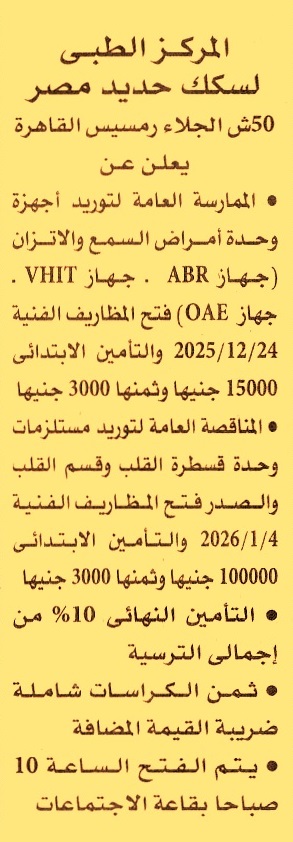 HOT Information مناقصة عامة لعملية توريد أجهزة وحدة أمراض السمع والاتزان “جهاز ABR, جهاز VHIT, جهاز OAE” عن جريدة الأهرام Post navigation جامعة الزقازيق شركة التعاون للبترول