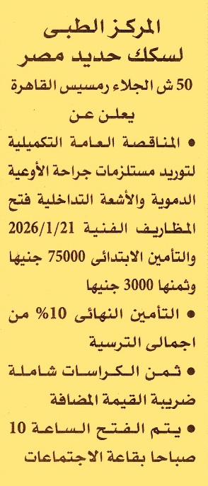 HOT Information مناقصة عامة لعملية توريد مستلزمات جراحة الأوعية الدموية والأشعة التداخلية عن جريدة الأهرام Post navigation جامعة الزقازيق شركة مياه الشرب والصرف الصحي بقنا