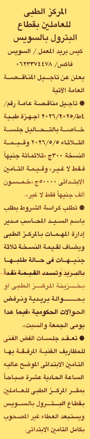 يعلن المركز عن تأجيل المناقصة العامة رقم 4ط/2025/2026 لعملية