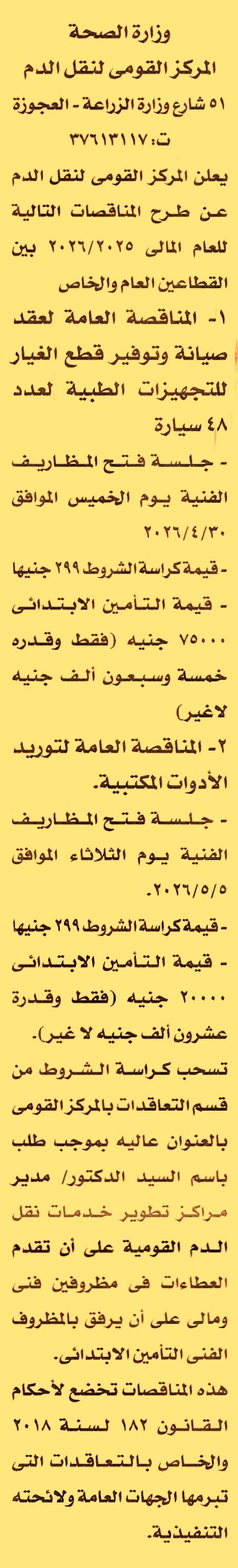 HOT Information مناقصة عامة لعملية صيانة وتوفير قطع الغيار للتجهيزات الطبية لعدد 48 سيارة عن جريدة الأخبار Post navigation الإدارة العامة لتنفيذ المشروعات بتوشكى نادي الجمهورية الرياضي بشبين الكوم