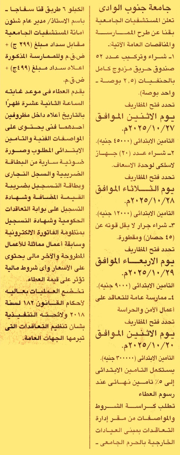 HOT information مناقصة عامة لعملية توريد وتركيب عدد 52 صندوق حريق مزدوج كامل بالحنفيات “2.5 بوصة, 1 بوصة” (يرفق مع المستندات سابقة أعمال) عن جريدة الجمهورية Post navigation جهاز تنظيم النقل البري الداخلي والدولي محافظة قنا