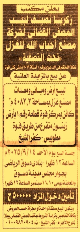 HOT Information مزايدة علنية لعملية بيع أرض ومباني ومعدات مصنع غزل بمساحة 4083.3م2 الكائنة بزمام فوه – مركز فوه – محافظة كفر الشيخ قطعة رقم 1 – طريق فوه مطوبس (المعاينة يومي 10 و11/9/2025) عن جريدة الجمهورية Post navigation جامعة المنصورة جامعة الزقازيق