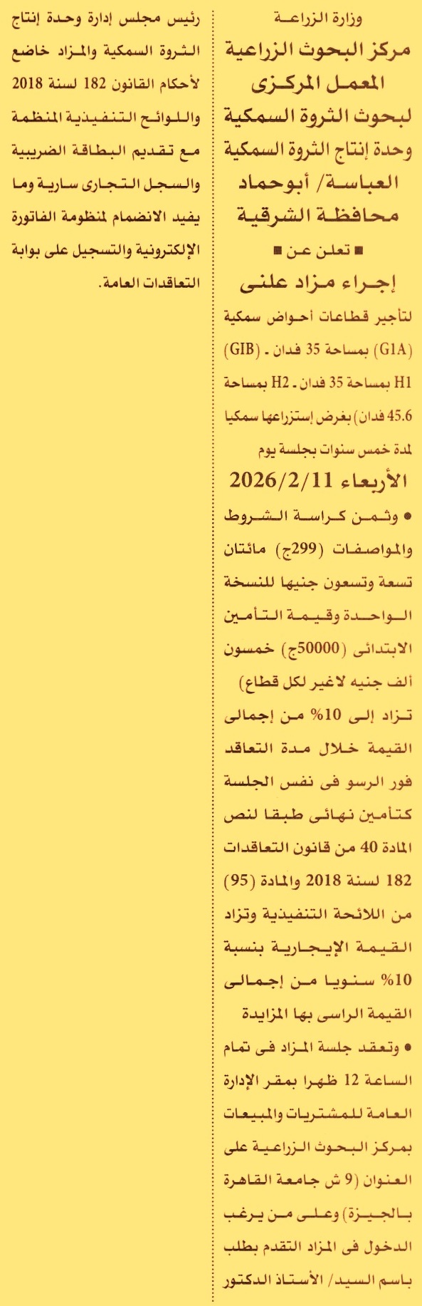 HOT Information مزايدة علنية لعملية تأجير قطاعات أحواض سمكية “GIA” بمساحة 35 فدان تقريبا – “GIB” H1 بمساحة 35 فدان – H2 بمساحة 45.6 فدان” بغرض استزراعها سمكيا لمدة 5 سنوات بزيادة 10% سنويا عن جريدة الأهرام Post navigation محافظة المنوفية محافظة سوهاج